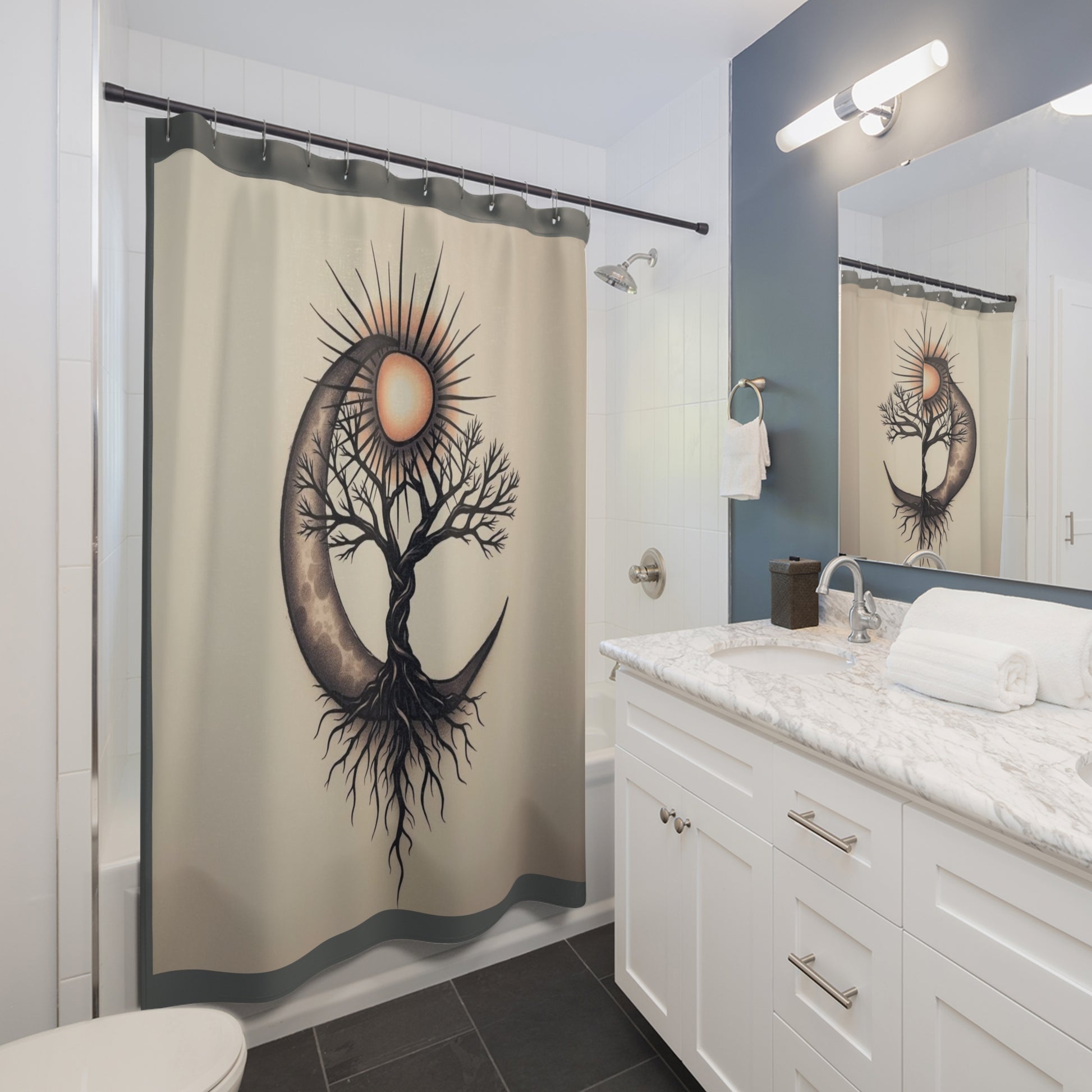 Transform your bathroom into a serene oasis with our beautifully designed shower curtains. Featuring a stunning one-sided print of a moon and sun intertwined with a tree, this piece adds a touch of artistic elegance to any space. Crafted from 100% polyester, it is not only durable but also quick-drying, ensuring a fresh look even in humid conditions. Perfect for those who appreciate nature-inspired decor, this shower curtain is ideal for both adults and anyone looking to bring a calming vibe to their daily routine. It makes a great gift for housewarmings, birthdays, or simply to elevate your own home decor. Celebrate moments of self-care or relaxation moments during holidays and special occasions with a beautiful design that inspires tranquility and harmony.
